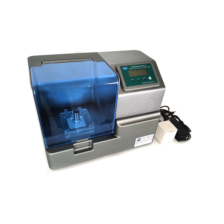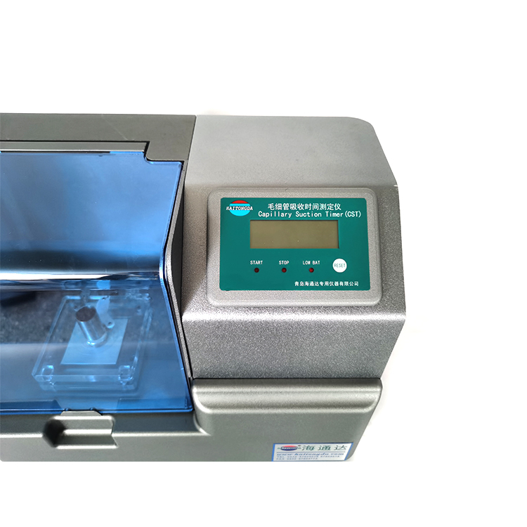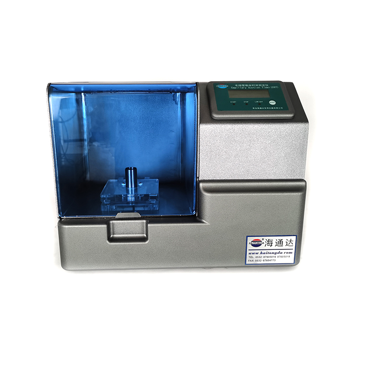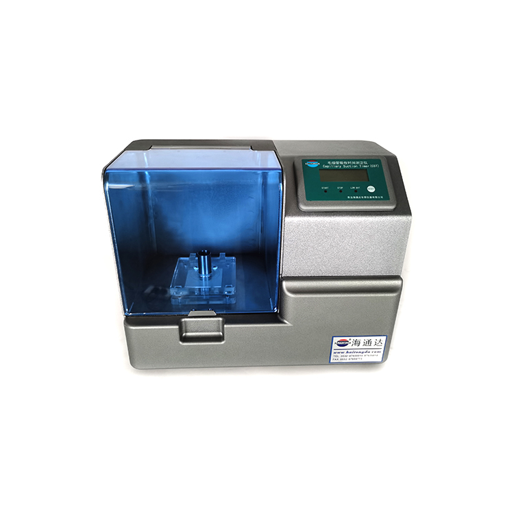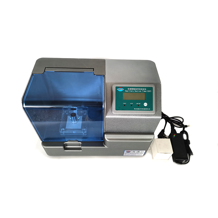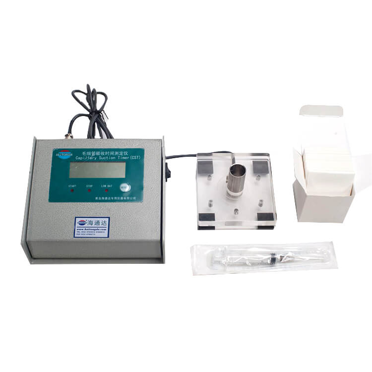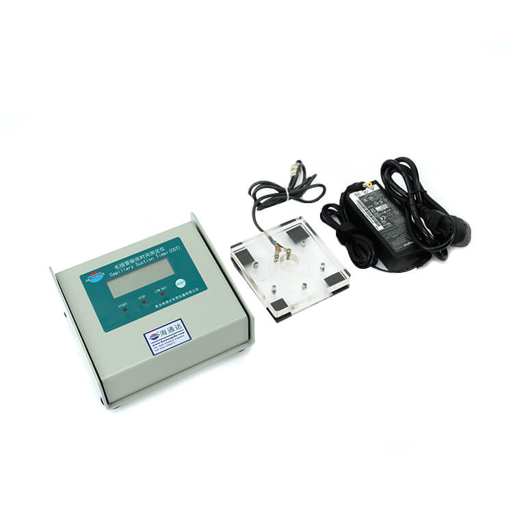 Таймер капиллярной пропитки Haitongda серии 158 модели HTD15811 содержит шкаф управления, в котором находится таймер, и подключается к испытательной головке с электродами. Жидкость соприкасается с толстой бумагой специального сорта, расположенной между акриловыми пластинами испытательной головки, и проникает в нее. Эта жидкость движется наружу от круглого пятна и достигает ближайшего электрического контакта на сенсорной пластине. Она будет продолжать распространяться, пока не достигнет следующего электрического контакта. Таймер капиллярного всасывания измеряет время, необходимое для распространения жидкости от первого электрического контакта до второго контакта.